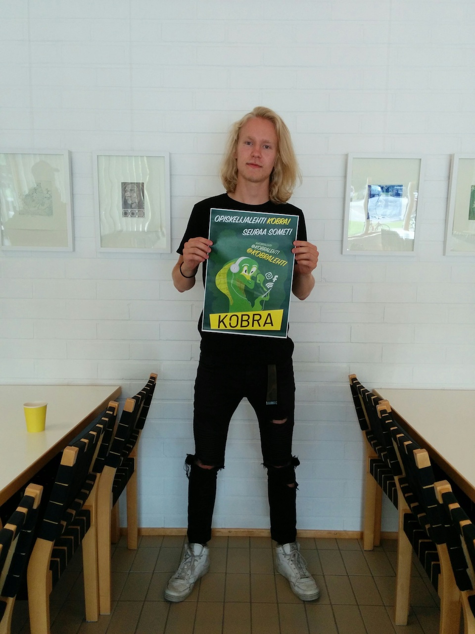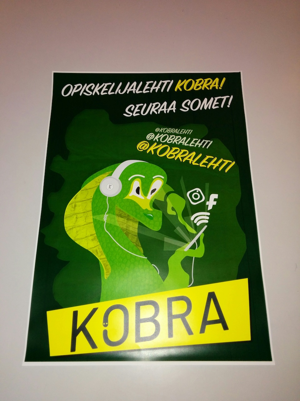 -Me tarvittiin markkinointikampanjaa Kobralehdelle, joten haluttiin saada paljon seuraajia sosiaalisessa mediassa, nii halusin tehdä aktivoivan julisteen siitä, missä kaikkialla meitä voi seurata.