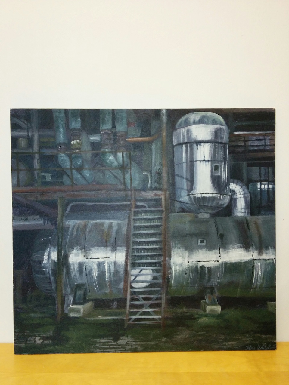 -Maalauksissa yritin vain löytää lähialueelta jotain sellaista, mitä ei ole vielä piirretty. Yksi maalauksista on kanavarannasta, koska siellä paistoi aurinko. Työssä tutkittiin valoa ja varjoa, ja vedenpintaan sai heijastuksia. Toisessa maalauksessa inspiraationa oli sellainen kuva, joka on otettu vastavaloon, jonka takia puut ovat mustia.